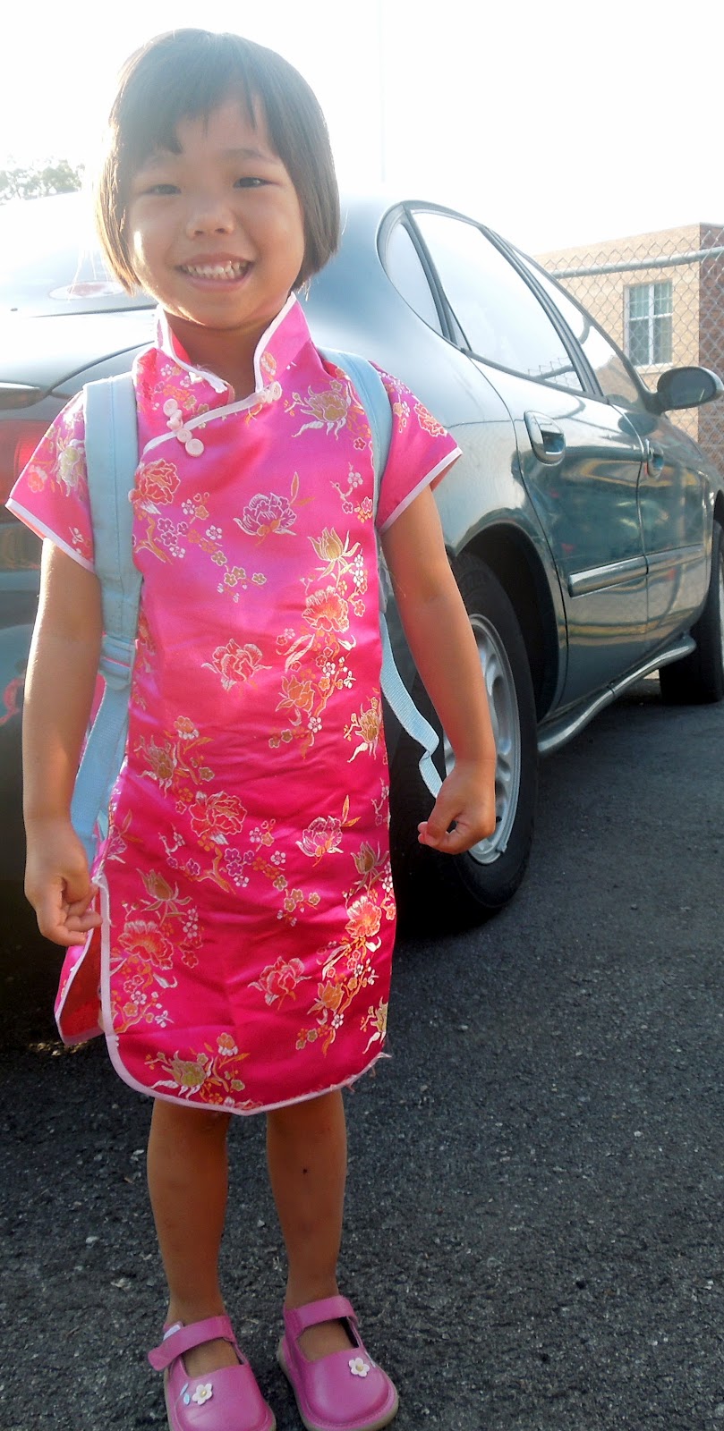 Here is a picture of Yi Mei on her first day. She picked out her Chinese outfit and squeaky shoes for the occasion.